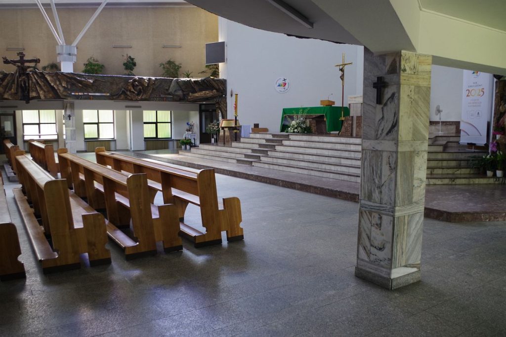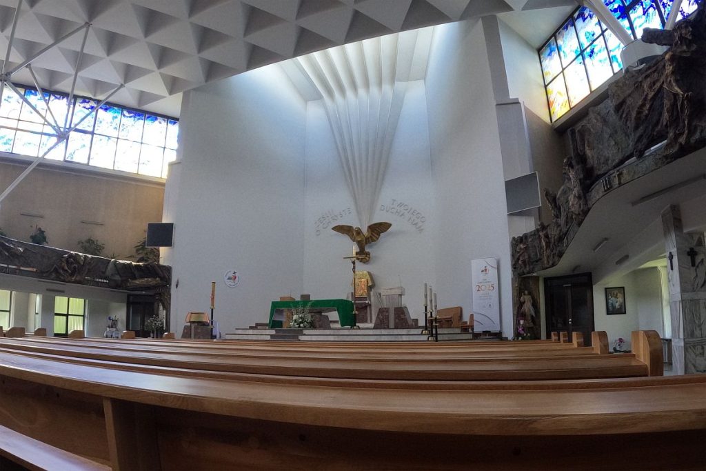 Gdy wchodzimy do świątyni, od razu wzrok przykuwa ołtarz główny. Na ścianie nad tabernakulum widnieje ogromna figura złotej gołębicy, która symbolizuje Ducha Świętego. Obok prezbiterium, po lewej stronie, stoi figura Matki Bożej, natomiast po prawej stronie znajduje się figura Jezusa Miłosiernego. Warto tutaj wspomnieć o kaplicy Jezusa Miłosiernego, której wejście znajduje się obok Jego figury. W kaplicy stoi telewizor, który ukazuje transmisję mszy świętej na żywo.