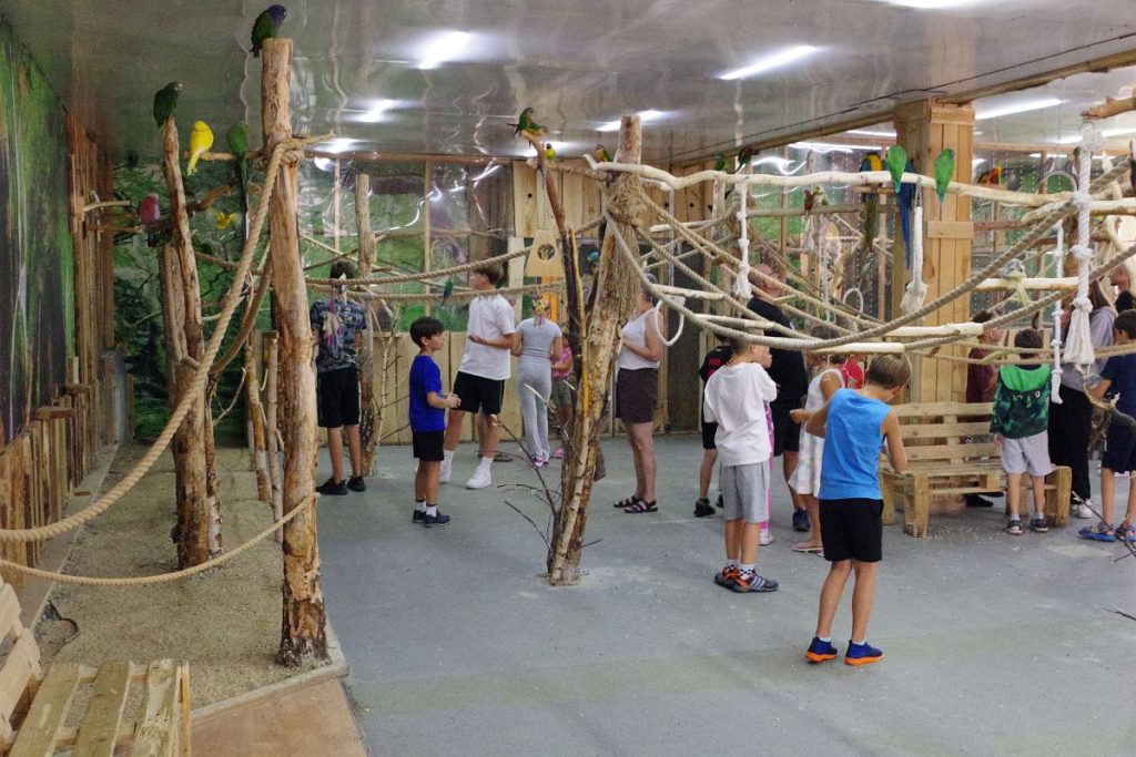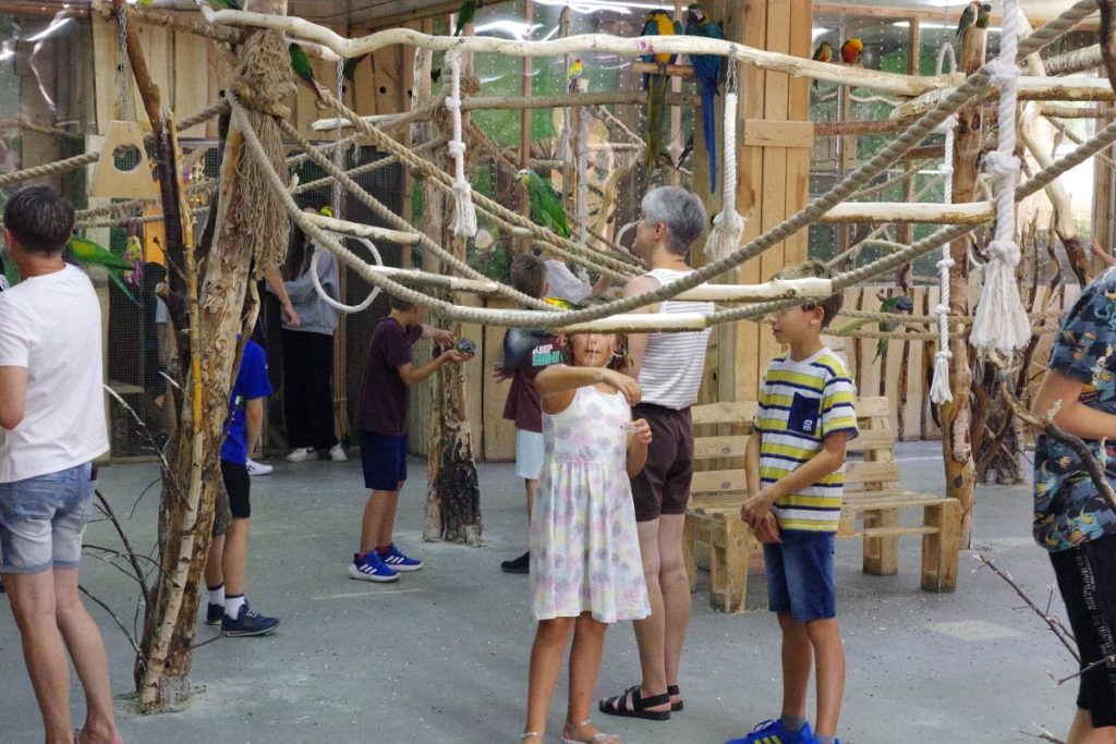 Papugarnia to też cenna lekcja odpowiedzialności i empatii. Dla dzieci, ale i dorosłych. Każdy ptak ma swój charakter, nawyki, sympatie. I trzeba się tego nauczyć, zrozumieć. To nie jest tylko „atrakcja turystyczna” — to żywa, emocjonalna przestrzeń spotkania ze zwierzęciem, ich naturą oraz instynktem. To wyjątkowe miejsce zamieszkuje kilkadziesiąt papug. Na miejscu można przeżyć wiele niesamowitych chwil a karmienie czy swobodnie latające między odwiedzającymi papugi to tylko jedne z nich. Wnętrze papugarni jest zaprojektowane z troską o komfort ptaków i ludzi. Dużo światła, zieleni, miejsc do odpoczynku. Atmosfera jest spokojna, bez hałasu i pośpieszenia. To miejsce, w którym można na chwilę zapomnieć o wszystkim i po prostu być „tu i teraz”.