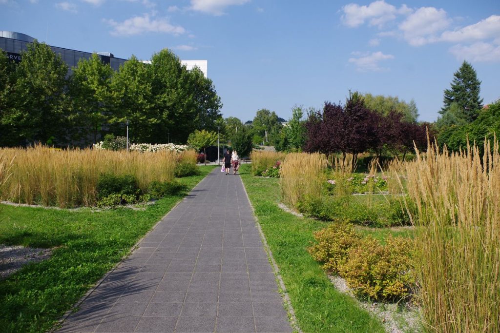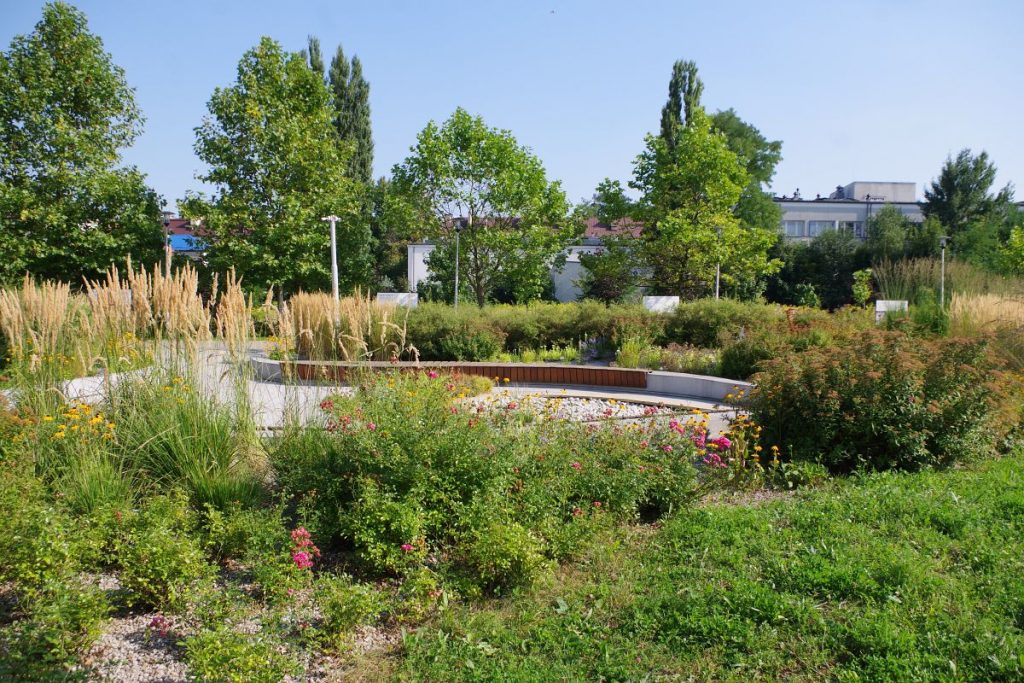 Projektanci z pracowni RS+ Robert Skitek stworzyli miejsce, które łączy funkcjonalność z pięknem. Wodny plac z obniżoną konstrukcją, ścieżkami przypominającymi rozbryzg wody, granitowymi siedziskami i schowanymi w pagórkach toaletami daje poczucie spokoju i estetycznej harmonii. Zieleń — wysokie trawy, barwne krzewy, łąki kwietne — sprawia, że Planty stały się prawdziwym ogrodem publicznym.